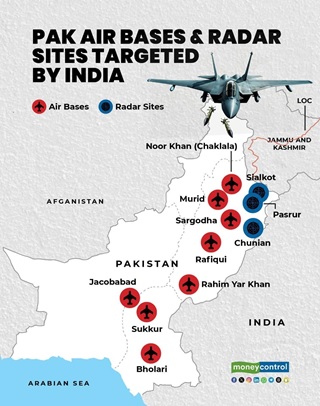 Following Operation Bunyan-al-Marsus, India targeted Pakistan's air force establishments, including eight air bases and three radar sites, as shown in the figure and table below. It was an extended step India took because the targets were the main military hubs, which paralysed the further use of air power by Pakistan, and it convinced the Pakistani military to seek a ceasefire. The majority of the runways, radars, and hangars were destroyed in this attack and were no longer operationally viable.